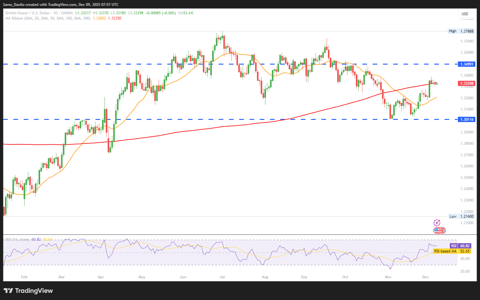 - Fed Decision: The Federal Reserve is expected to cut rates by 25 bps at its final 2025 meeting on Wednesday, a move that could shape near-term USD direction and volatility in GBP/USD.