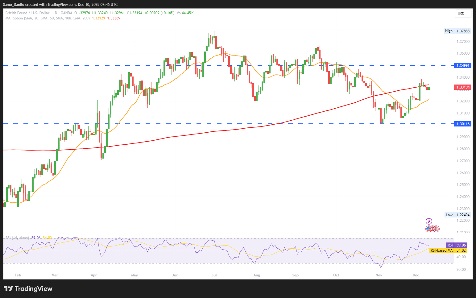 - GBP/USD Price: GBP/USD trades slightly higher near 1.3320 in early European hours, supported by mild Sterling demand.