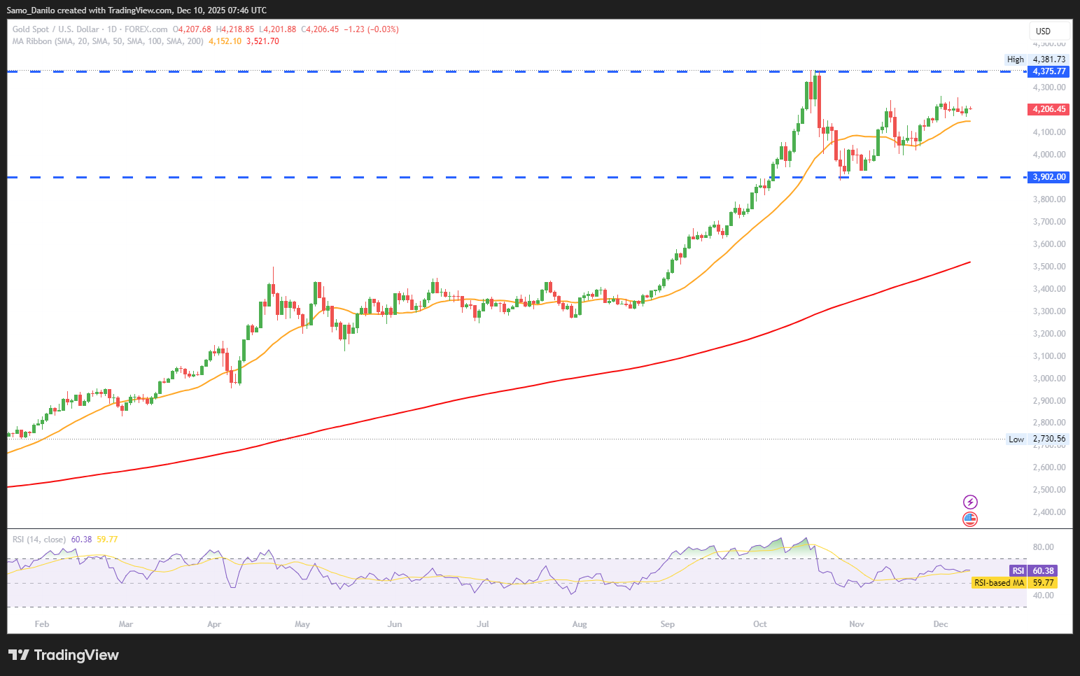 Closing statement: Gold holds a mildly positive bias as geopolitical risks and softer USD sentiment offset strong US labor data, keeping XAU/USD supported near weekly highs.