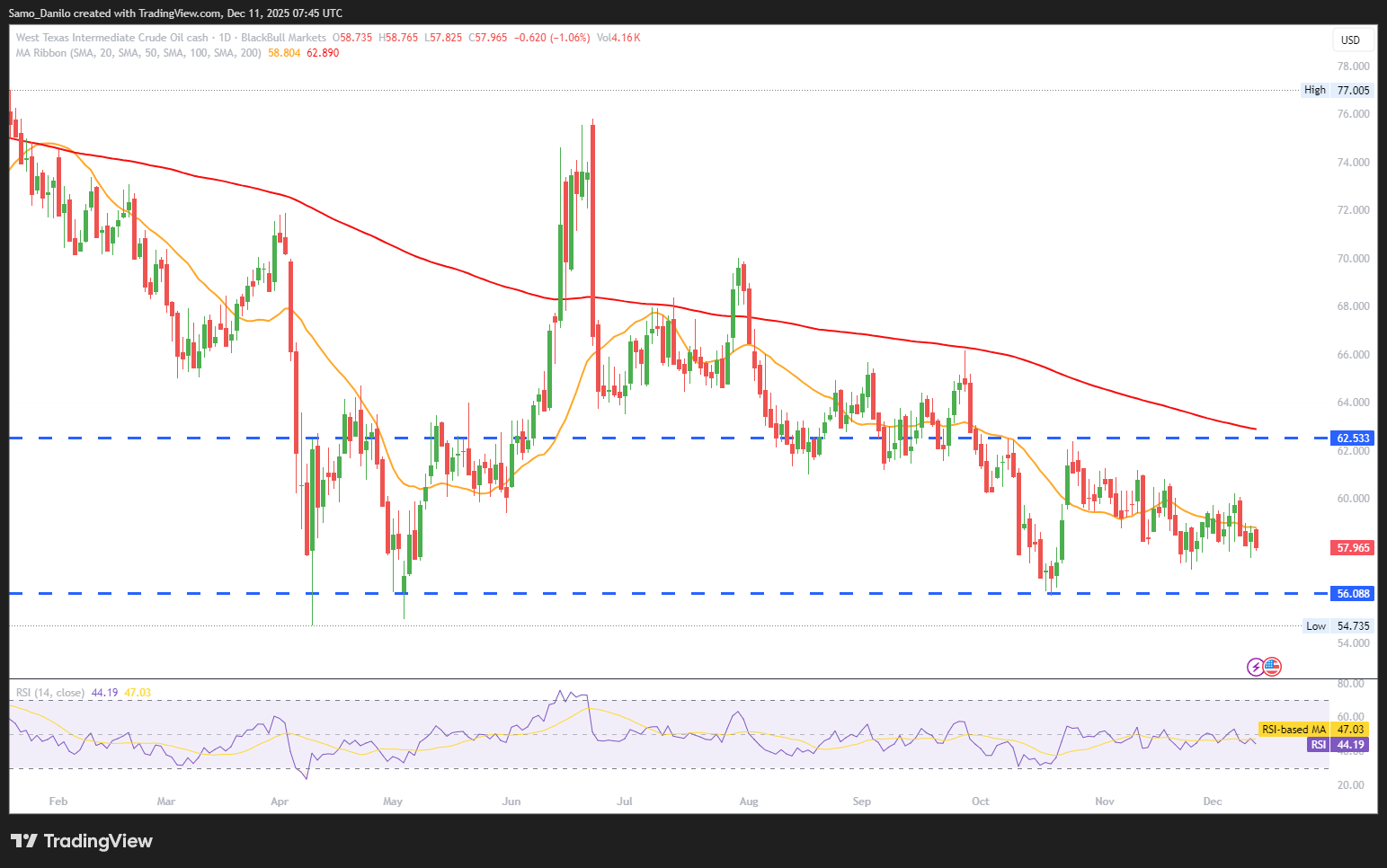 Closing statement: WTI remains under pressure as rising supply and weaker-than-expected demand outweigh geopolitical risks. Unless economic conditions improve or OPEC+ signals a shift back toward tighter policy, the price bias is likely to stay mildly bearish in the near term.