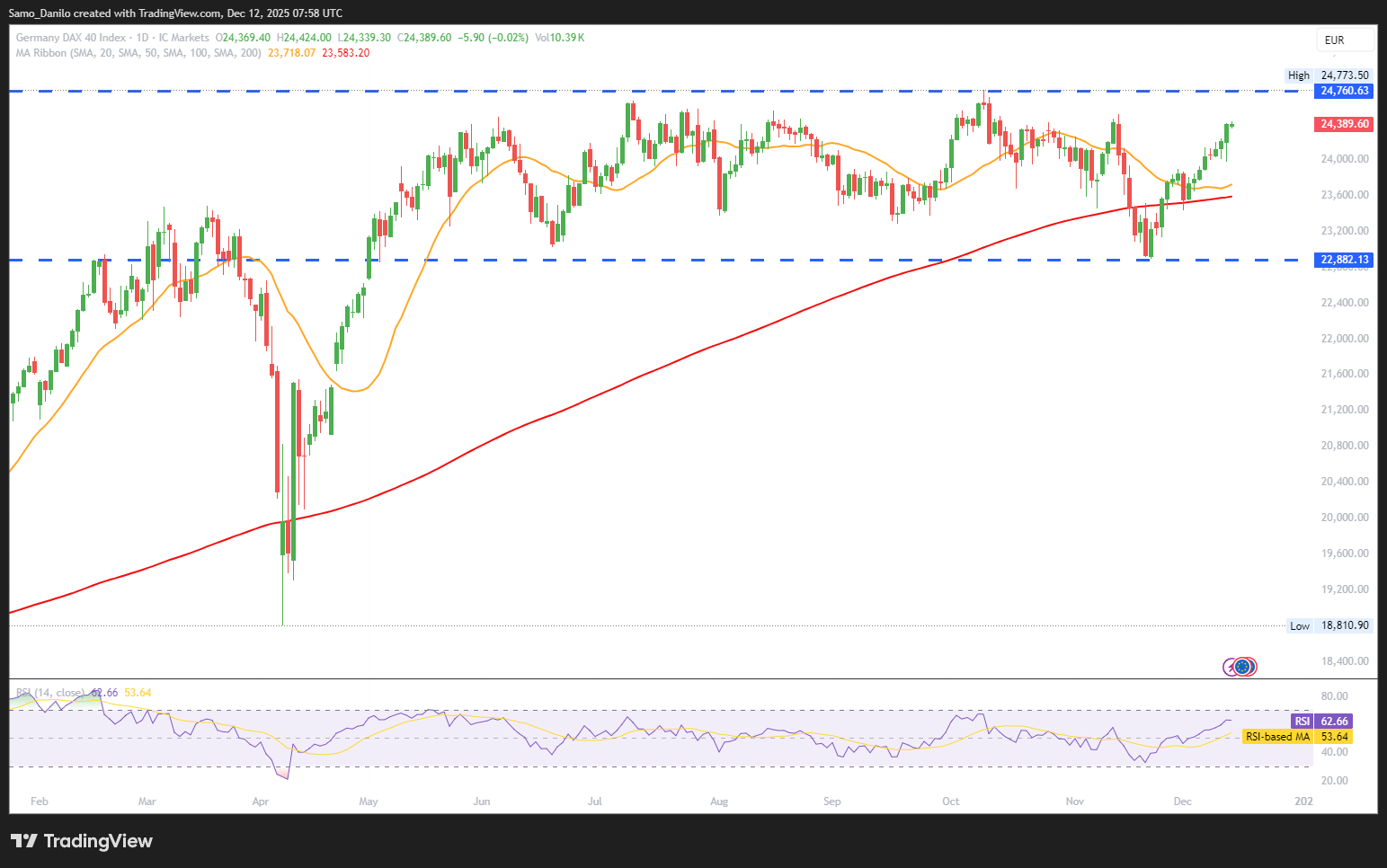 - DAX Price: Germany’s benchmark index trades higher near 24,400 after a mild pullback from Thursday’s intraday peak. The index remains supported by broad sector gains and improved risk appetite.