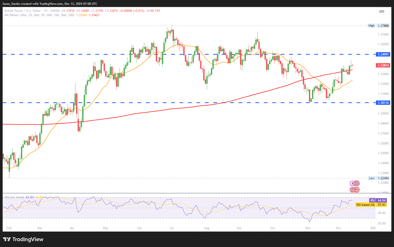 - GBP/USD Price: GBP/USD remains in bullish territory but faces clear resistance at the 1.3400 level. The stalling momentum suggests buyers may need stronger macro catalysts to extend gains.