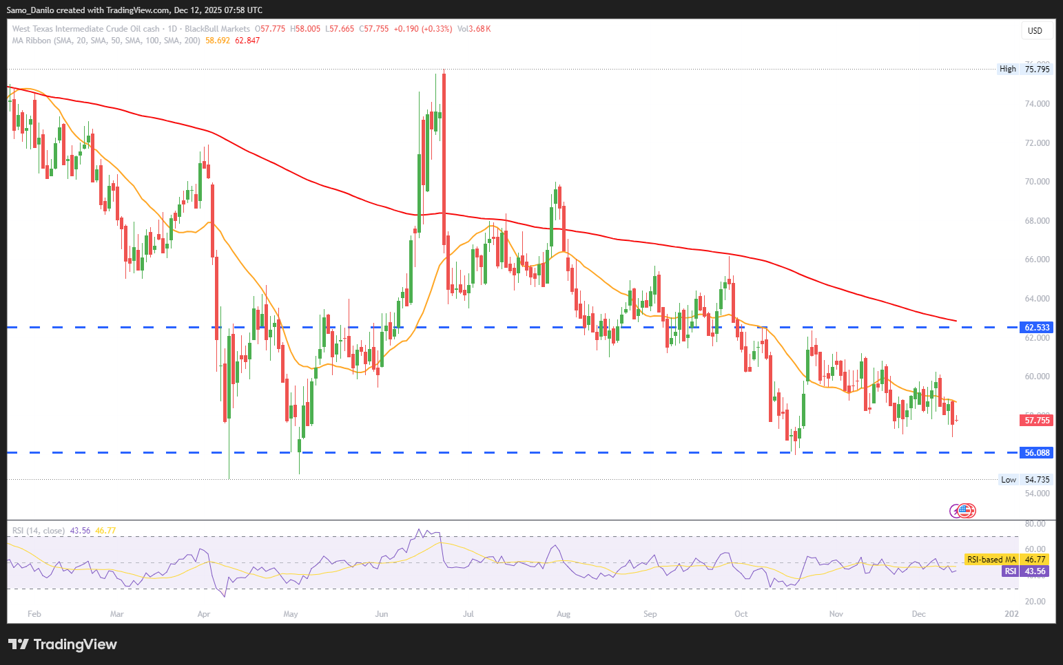 - Crude Oil Price: WTI trades lower near $57.70 early Friday, extending its pullback as market sentiment remains fragile. The move reflects ongoing supply–demand uncertainty and broader geopolitical pressures.